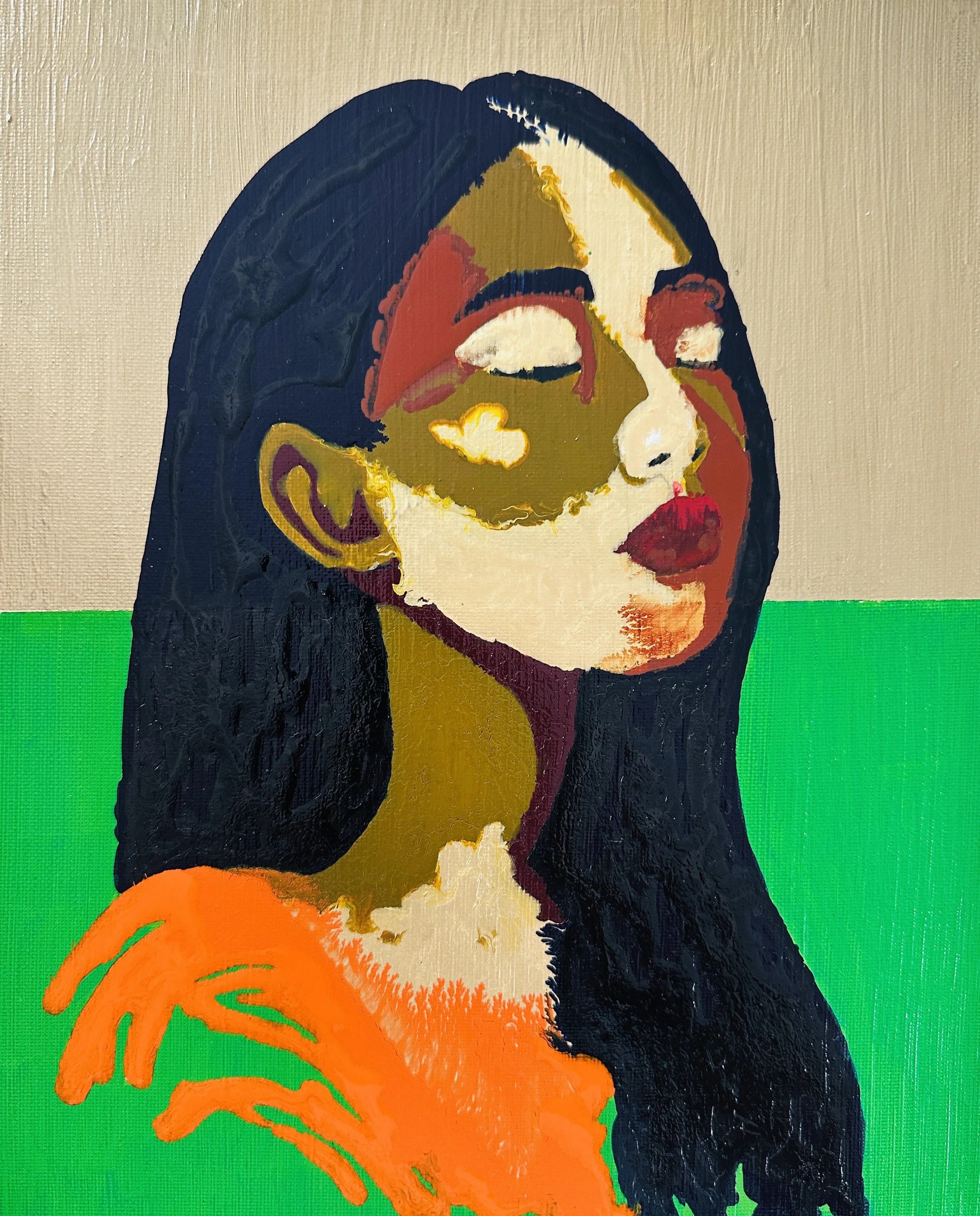 Fiore, meaning “flower” in Italian, represents beauty, resilience, and renewal. With her head gently tilted upward and her golden earrings glowing, she evokes the image of a woman blooming with self-assurance. The warm red backdrop enhances her strength and vibrancy, turning her calm expression into a living symbol of empowerment and feminine grace.